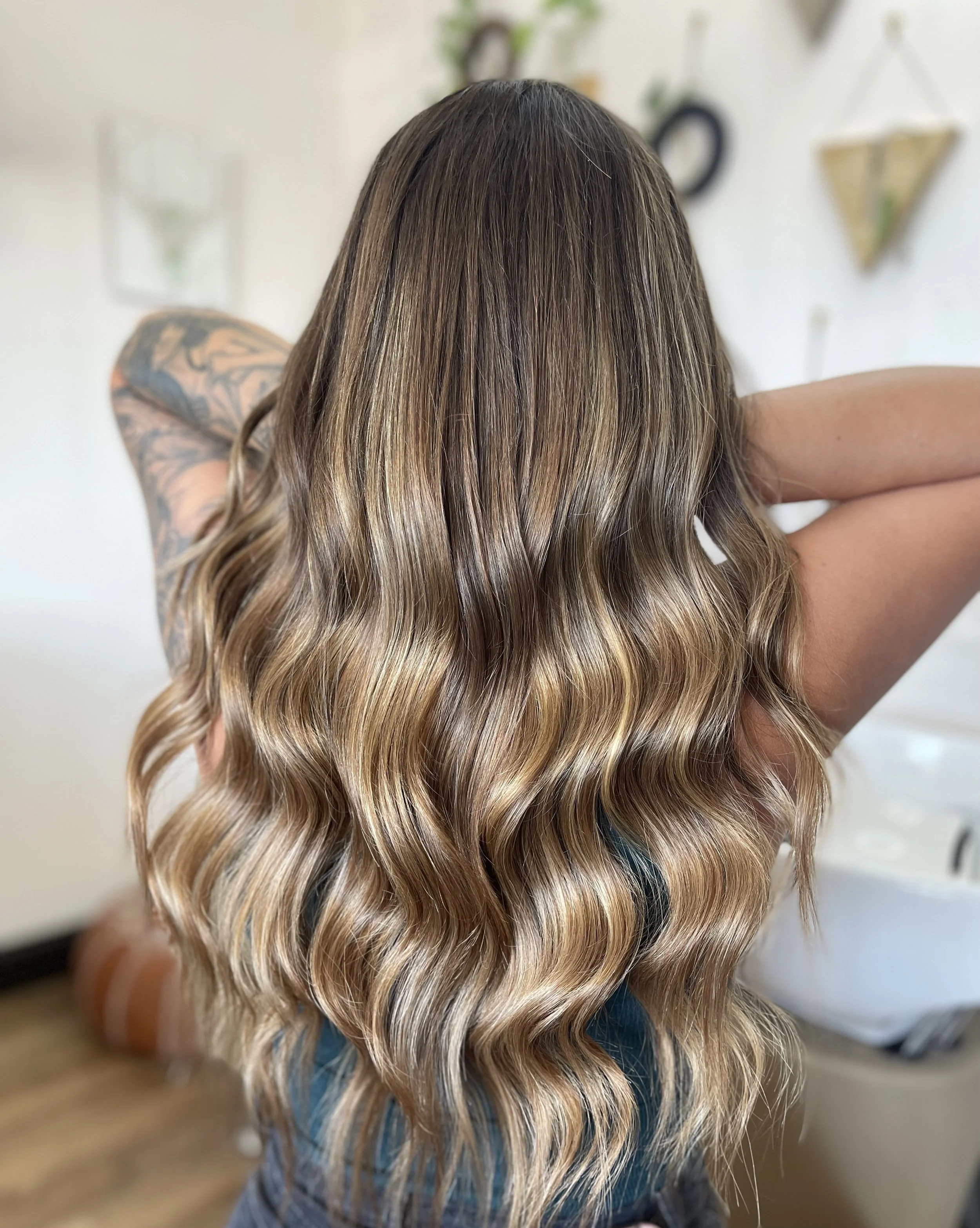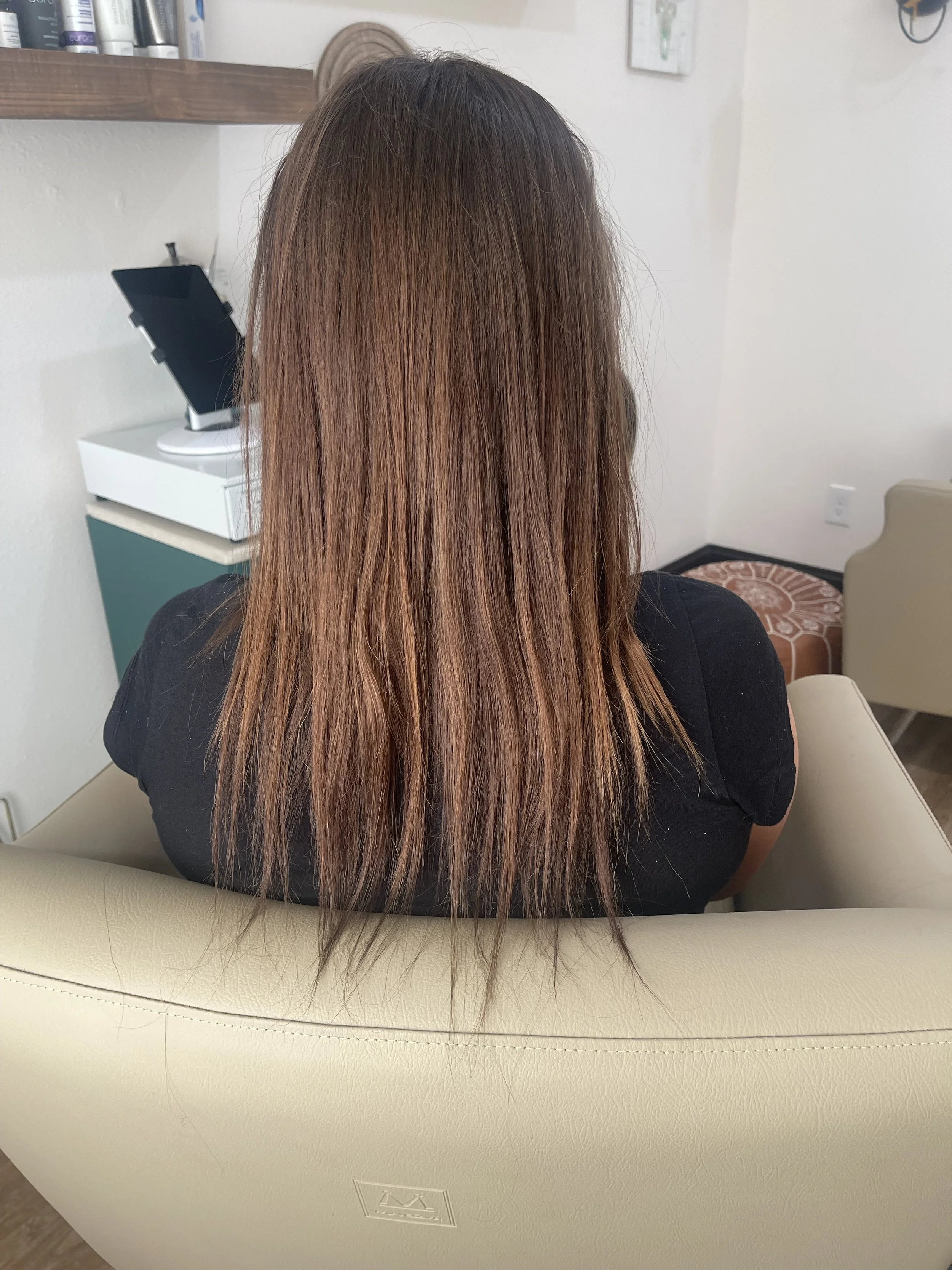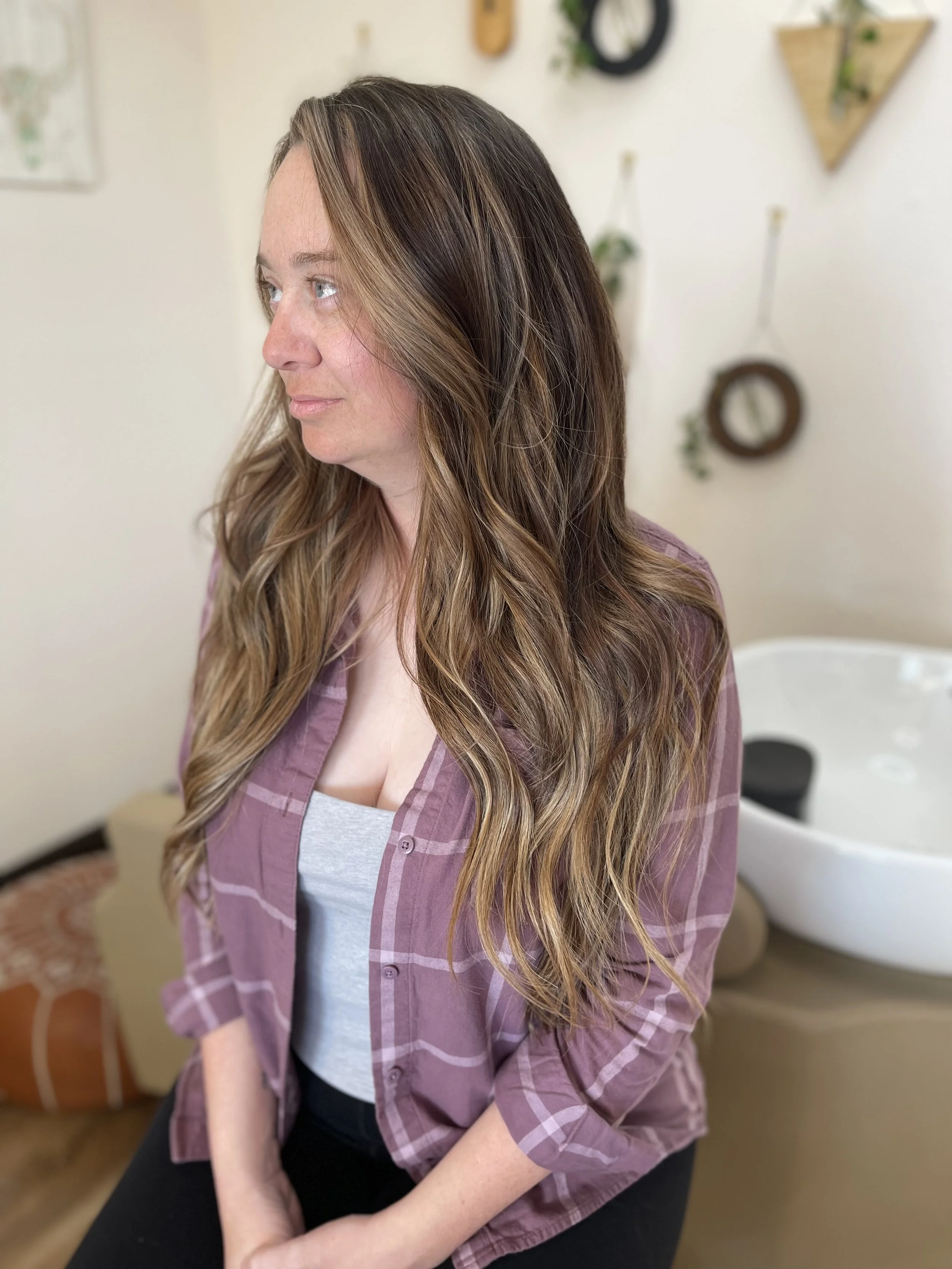 Amber’s Experiences: Extension installation every 8 weeks. Once a quarter she receives a mini balayage and scalp detox to brighten around her face and refresh her scalp to refresh her hair color and scalp health.