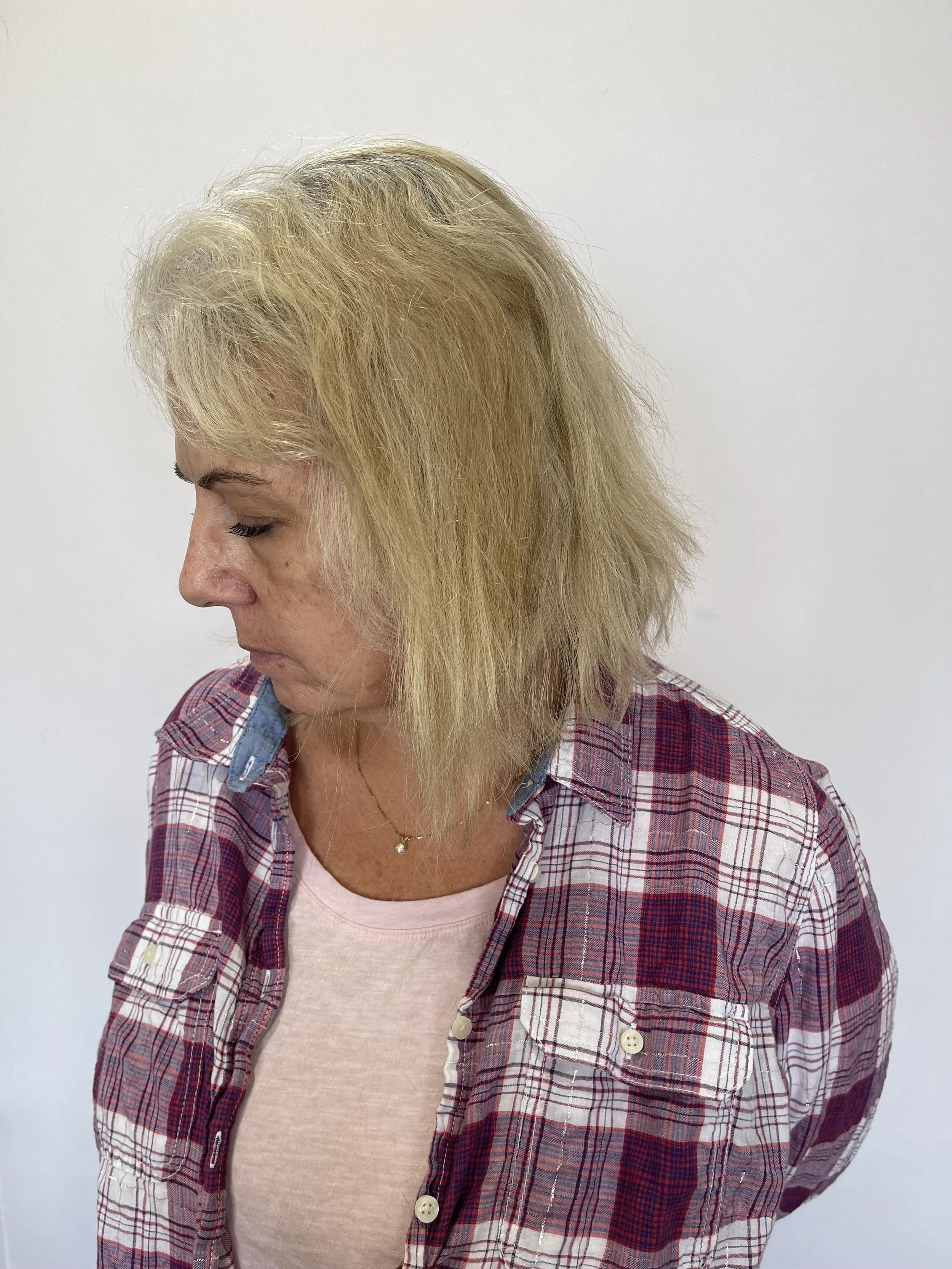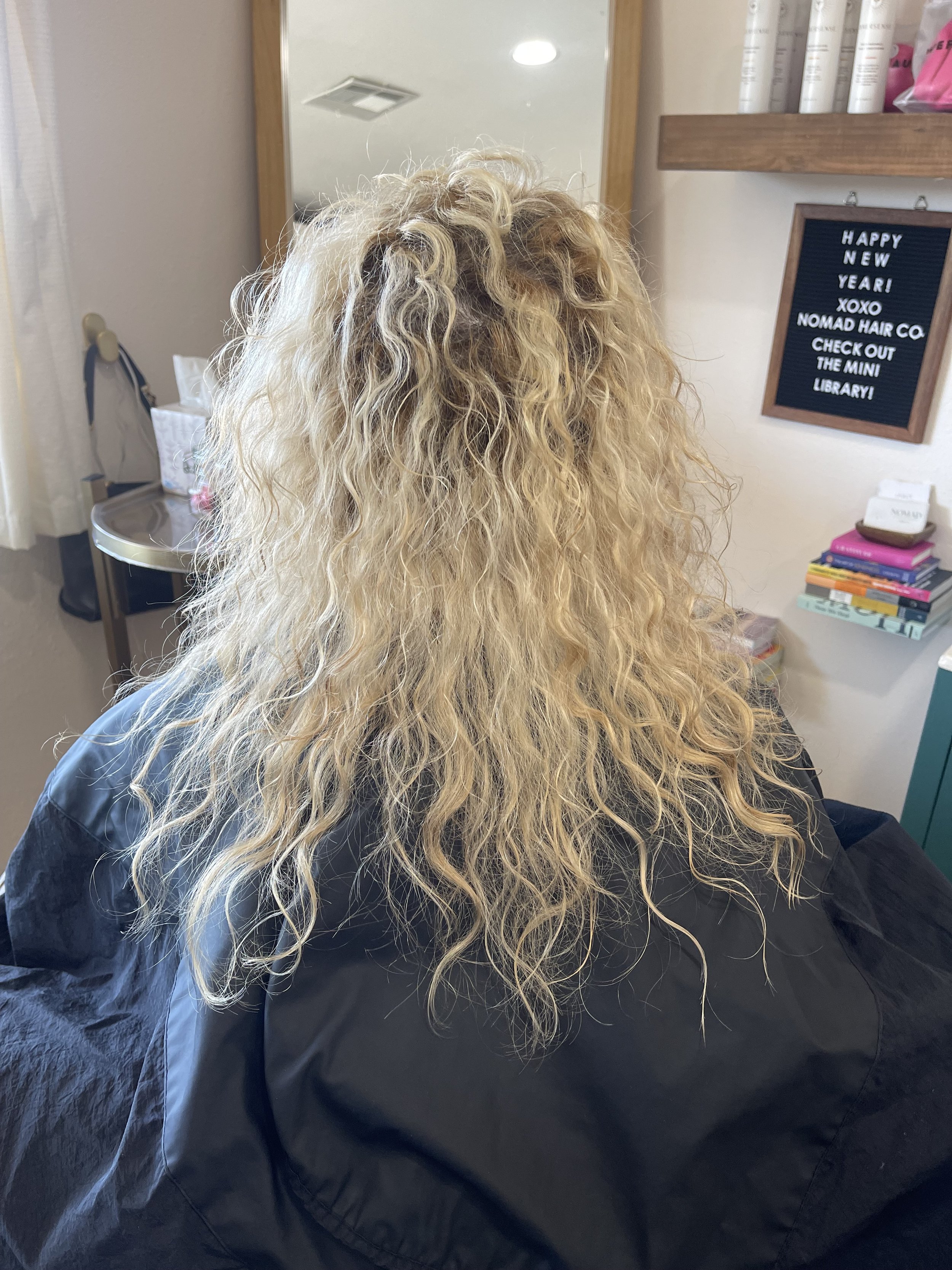Jill’s Experiences: Full Highlight with Classic or Curly/Custom Haircut (Fine Density) every 7 weeks. Diana utilizes a combination of high-lift color and lightener create her bright blonde dimension, without brass or compromised integrity. Once every 4th session Jill receives the Strand Detox and Amino Acid (Protein) Treatments to result mineral build-up and reinforce bond strength.