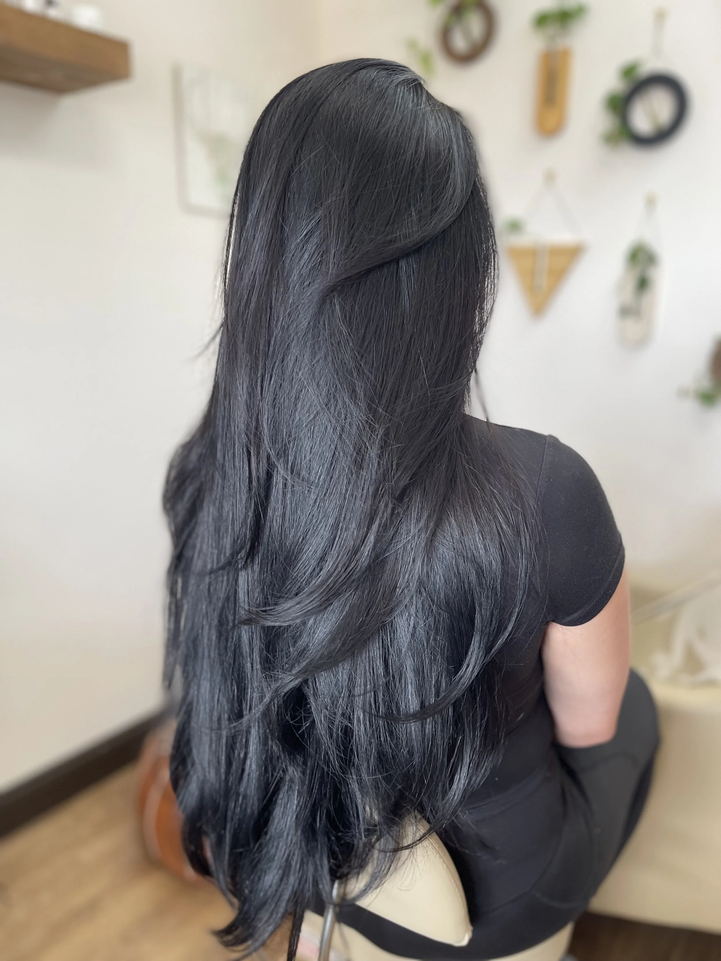 Trish’s Experiences: Custom Haircuts (Medium Density), Partial Balayage, Lipid Balancing and Strand Detox Treatments every 8 weeks. This aided in the natural grow-out of her bobbed hair that was previously over processed. After the integrity of her hair was restored, the following sessions, the dark pigment was slowly lifted out. In the last 6 months, she’s been enjoying 3 22” rows of extensions while her hair continues to grow past her shoulders.