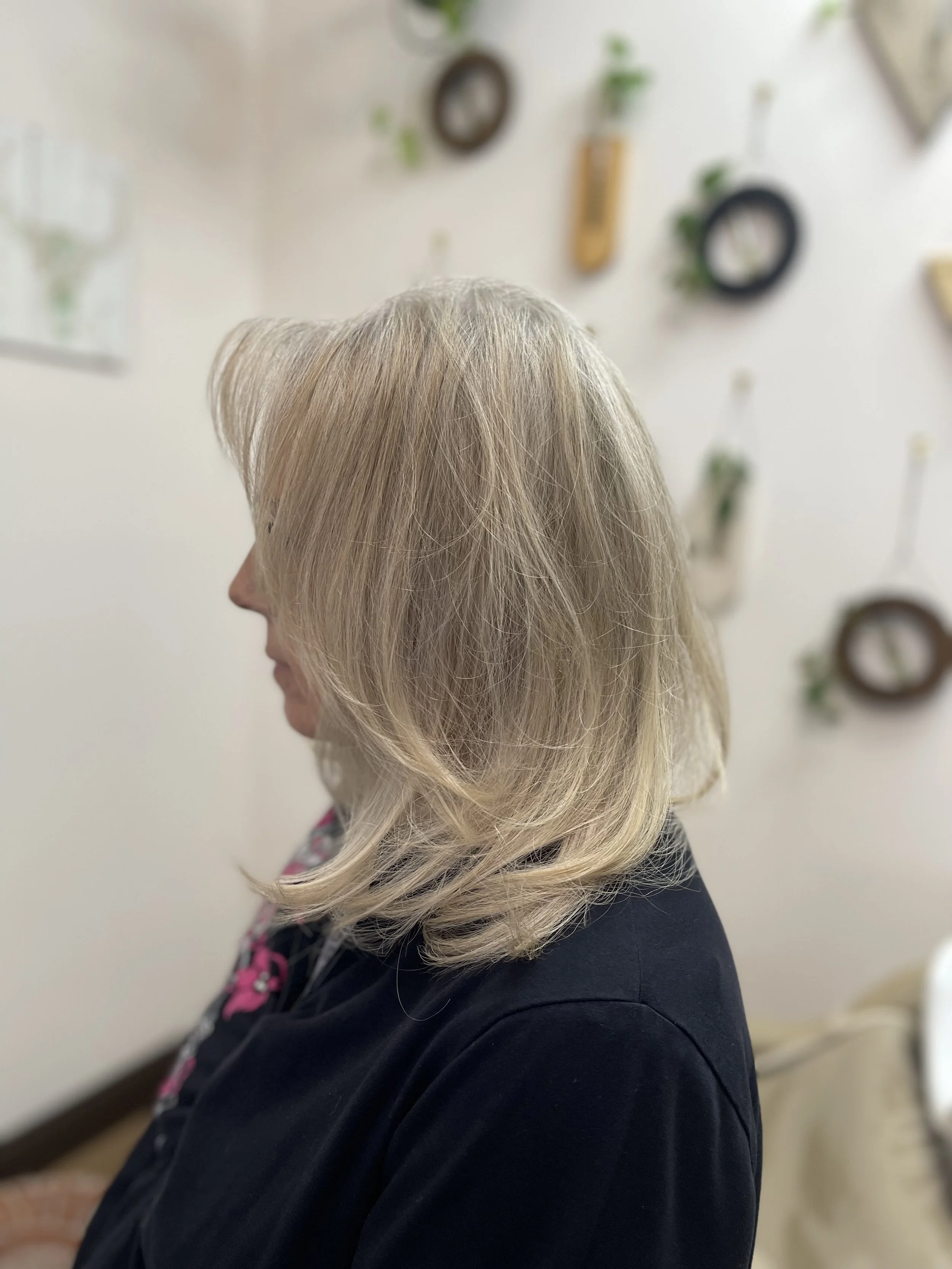 Chandra’s Experiences: Alternating Full and Partial Highlight with a Shadow-Root every 8 weeks. Haircut and bond builder treatment at each visit to aid in blending her silver strands, maintaining shine and buoyancy.